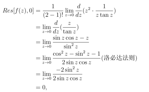 解 f(z)的奇点是使z tan z = 0的点.z = 0为f(z) 的二级极点,zk =kπ(k =±1,±2,···)为f(z)的一级极点.这些奇点中只有z =0 在圆周|z|=1内.
