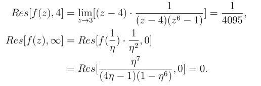 在|z|=3的外部的奇点为1级极点z =4及z =∞,且