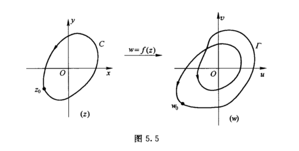 考虑变换w = f(z),当z沿简单闭曲线C的正向绕行一周时,对应点w在w平面内就画出一条连续的封闭曲线Γ; 它不一定是简单的闭曲线,它可以按正向绕原点若干圈,也可以按负向绕原点若干圈.由于f(z)在C上不为零,因此在w平面内Γ也不经过原点(图5.5).