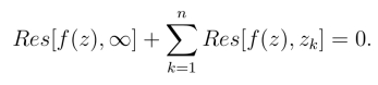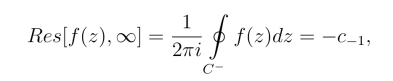其中C为R <|z| <+∞内绕原点的任意一条正向简单闭曲线,c-1为f(z)在z = ∞的去心邻域内的洛朗展开式中z-1 的系数,要特别注意的是在z = ∞的去心邻域内的洛朗级数是被看作以原点为中心的圆环域展开的,即z0 =0.
