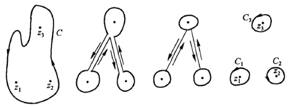 从闭路变形原理可以直观地看出留数定理的正确性,如下图所示.