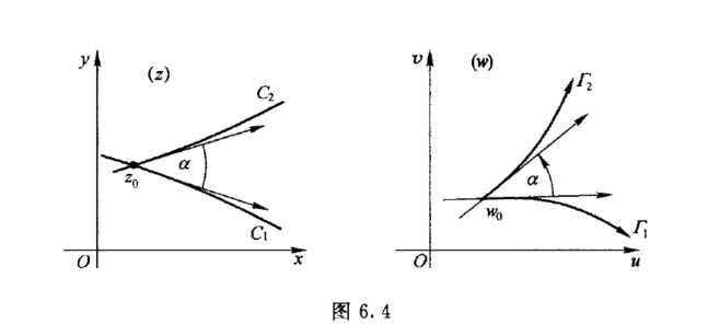 相交于点z0的任何两条曲线C1与C2之间的夹角,在其大小和方向上都等同于经过w =f(z)映射后跟C1 与C2 对应的曲线Γ1与Γ2之间的夹角(图6.4).所以这种映射具有保持两曲线间夹角的大小与方向不变的性质.这种性质称为保角性.