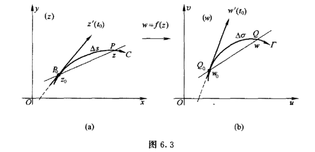 z0 =z(t0),且z′(t0)0,在映射w =f(z)下,C的象曲线Γ(图6.3(b)) 为: