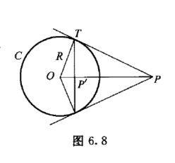 设P在C外,从P作圆周C的切线PT,由T作OP的垂直线TP′与OP并于P′,那么P与P′即互为对称点(图6.8).这是由于△OP′T ~△OTP.因此,OP′ :OT =OT :OP,即OP ·OP′ =OT2 =R2.