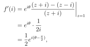 即arg f′(i) = θ-由条件(2)及arg f′(i) 的几何意义(将z平面的矢量旋转角度arg f′(i)),因此