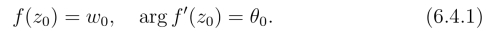 将上半平面一一对应地映射为单位圆的分式线性映射有无穷多个,其一般表达式中含有两个任意常数,要确定这些常数就需要给出含有它们的两个等式.由此可以看出式(6.4.1)中的这两个条件是不可少的; 其中f(z0)=w0的实部和虚部分别相等,以及arg f′(z0) = θ0可用来确定w = f(z)所依赖的三个实参数,使该映射是唯一的.