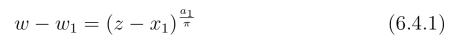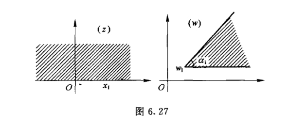 我们注意到,幂函数w = zn把以z = 0为顶点,张角为a1(0 ≤a1 ≤2π)的角形域映射成以w =0 为顶点,张角为na1的角形域.从而,映射将x轴上的点x1映射成w平面上的点w1,z平面的上半平面映射成顶点在w1,张角为a1的角形域(图6.27).这样,映射(6.4.1)可由下面的方程