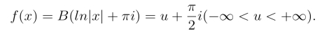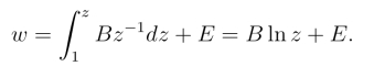 解 该二角形区域在点w1和w2的顶角都为零,由式(6.4.5),所求映射为由f(1) = 0得E = 0.再由条件f(0) = w1和f(∞) = w2可以看出,当z从点z = 1沿实轴减少到零再无限减小时,对应点w 沿上述二角形边界的绕向是从w = 0 沿负实轴减少到w1 = f(0),然后再沿直线Imw = π 从顶点w1变到顶点w2.这表明,B为正实数,且当-∞<x <0时有