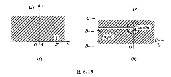 16.求将上半平面Imz >0一一对应地映射为图6.29(b)所给三角形区域的保角映射,并且使点z = -1,0,∞分别映射为该三角形的顶点A、B、C.其中A为ω =2πi.