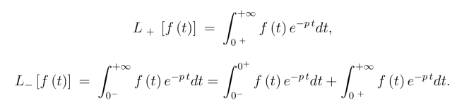 中的下限取0-或0+积分结果相同.但当f(t)在t = 0的邻域无界,特别是f(t)在t = 0 的邻域包含了脉冲函数时,拉氏变换的积分下限必须明确指出是0- 还是0+,这是因为