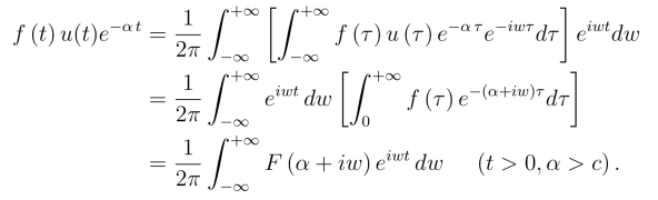 函数f(t)的拉氏变换,实际上是f(t)u(t)e-α t 的傅氏变换,当f(t)u(t)e-α t满足傅氏积分定理条件时,按傅氏积分公式,在f(t) 的连续点处有