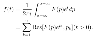 定理1 设p1,p2,··· ,pn 是函数F(p) 的所有奇点,(适当选取α >c,使得这些奇点全在半平面Re(p)<α内),当p →∞时,F (p)→0,则有
