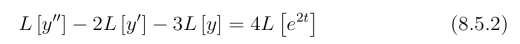 从上面例题可以看出,要用拉氏变换解边值问题,可先把该问题看作初值问题求解.得到的解含有未知的初值,如(8.5.4)中的y′(0),该初值可由已给的边值(如本例中的y(1)=2)求得.
