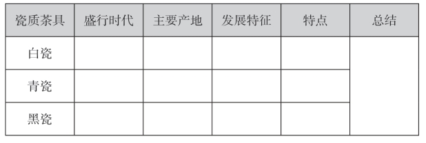 1.了解瓷质茶具的材质及种类(白瓷茶具、青瓷茶具和黑瓷茶具)。