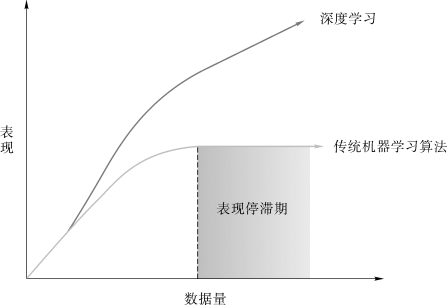 图2 深度学习随着数据量的增加可大幅提高性能表现