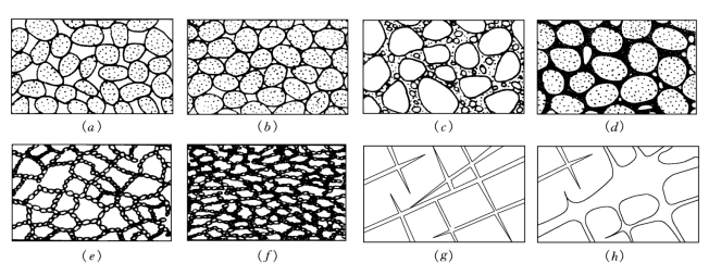 (a)分选良好,排列疏松的砂;(b)分选良好,排列紧密的砂;(c)分选不良的,含泥、砂的砾石;(d)经过部分胶结的砂岩;(e)具有结构性孔隙的粘土;(f)经过压缩的粘土;(g)具有裂隙的岩石;(h)具有溶隙及溶穴的可溶岩