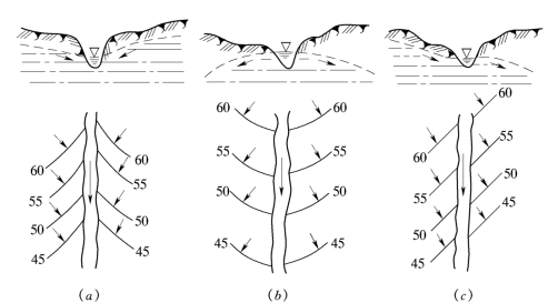 (4)确定潜水与地表水之间的相互补给关系:根据邻河地段潜水的流向可以判断潜水与河水之间的关系。图2-3和图2-4中(a)表示潜水流向河流,表明潜水补给河水。图2-4中(b)表明河流补给潜水。从图2-4中(c)可看出右岸河流接受潜水补给,左岸河水补给潜水。