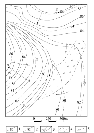 (3)确定潜水的埋藏深度:区域内某一点的地形标高和潜水位之差即为该点潜水的埋藏深度。图2-3中,D点潜水位的埋深为地形标高90m减去该点的潜水位86m,即等于4m。