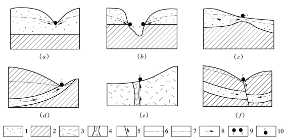 (a)侵蚀下降泉;(b)接触下降泉;(c)溢出泉;(d)侵蚀上升泉;(e)接触上升泉;(f)断层泉