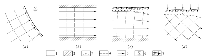 作流网时,首先根据边界条件绘制容易确定的等水头线或流线。边界包括定水头边界、隔水边界及地下水面边界。地表水体的断面一般可看作等水头面,因此,河渠的湿周必定是一条等水头线[图4-6(a)]。隔水边界无水流通过(通量为零),而流线本身就是“零通量”边界,因此,平行隔水边界可绘出流线[图4-6(b)]。地下水面边界比较复杂,当无入渗补给及蒸发排泄、有侧向补给作稳定流动时,地下水面是一条流线[图4-6(c)];当有入渗补给时,它既不是流线,也不是等水头线[图4-6(d)]。