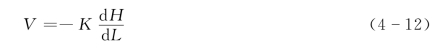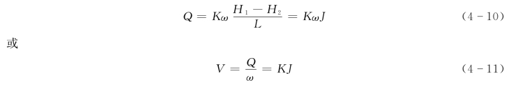 式(4-10)和式(4-11)就是达西公式,它表明渗流流量或渗流速度与水力坡度的一次方成正比。所以又称为直线渗透定律。