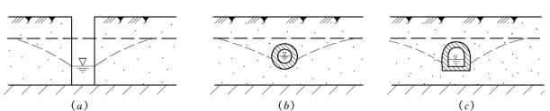 不同类型的取水构筑物具有不同的水动力特征和规律。因此,在进行取水构筑物的水文地质计算时,应先确定取水构筑物的类型。地下水取水构筑物分水平取水构筑物和垂直取水构筑物两大类。水平取水构筑物有渗渠、沟、渗水管、渗水廊道等(图4-12),它是在水平面上铺展,设在一定深度范围内,地下水从两侧渗入构筑物内。主要用于埋藏较浅,厚度不大的含水层中截取河流渗透水和潜水。