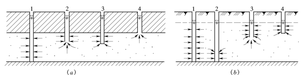 垂直取水构筑物有管井、大口井、钻孔等。由于垂直取水构筑物可以汲取较深层的地下水,因此实际工作中应用较多,地下水流向垂直取水构筑物的运动为水文地质计算的主要内容。垂直取水构筑物中根据含水层的类型可分为潜水井和承压井。根据井揭示含水层的程度和进水条件可分为完整井和非完整井。图4-13中的1为完整井,其主要特征是揭露了整个含水层的厚度,并在其全部厚度上井壁都能进水,此时地下水从四周以辐射流的形式向井内渗流。图4-13中的2、3、4为非完整井,进水条件可以是井底、井壁同时进水,也可以只是井壁进水或只是井底进水。一般说来,对于管井(井径小,深度大)主要为井壁进水,在管井的最下部常要设置沉砂管,因此,管井底部进水的情况是很少的。对于大口井(直径大,深度小)则要看含水层的厚度、岩性和井的深度、直径,来决定进水方式。