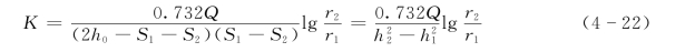 当抽水井附近有两个观测孔时,同样方法可得K值的计算公式: