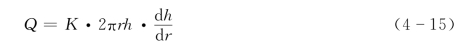 取柱坐标系统,以井轴与隔水底板的交点为坐标原点,井轴线为h轴,向上为正,沿隔水底板井径方向为r轴,由井轴向外取正(图4-14)。则含水层中流向井的每一个过水断面上的流量均可由裘布依微分方程表示