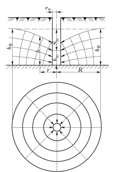 抽水前,天然条件下井中的水位称静止水位,开始抽水后井中水位不断下降称动水位。此时,与井周围的天然水位形成水位差,井周围地下水即向井中汇流,形成一个以井为中心的漏斗状潜水面,称为降水漏斗。当含水层水量充沛,井的涌水量较小时,经一定时间后,周围地下水向井的径流量与井的涌水量相平衡,漏斗便不再发展而达到稳定状态。此时,漏斗边缘到井轴间的距离叫影响半径,以R表示之。此时,过水断面为一系列曲面,在远离抽水井处近似为圆柱面。通过各断面的潜水流量均相等,等于井的涌水量。水力坡度和流速是个变量,在距井越近的地方,J和V值越大。渗透速度在三个坐标上均有分量,水流为三维流运动。但是当井中水位降深不大时,水流属缓变流动,渗透速度的垂直分量相对于水平分量来说很小而可以忽略,可把三维流简化为二维流。曲面过水断面可以近似地认为是一系列的圆柱面,断面上的水头值视为是相等的。