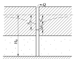 在裘布依公式中若为承压水层时二者为线性关系,而潜水层时为抛物线关系。大量的抽水实践表明,裘布依公式所反映的上述关系仅适用于小降深抽水的情况。降深较大时,水流的流态发生变化,裘布依公式计算结果偏大。