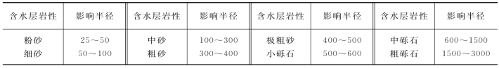 不同的岩土,影响半径值不同,常用的影响半径经验数据如表4-2所示。