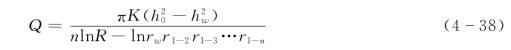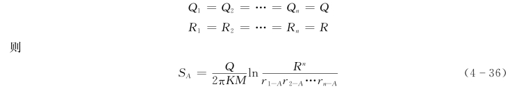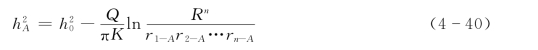 在上述条件下井群按半径为R0的圆周均匀布置(如图4-19)。设每口井的抽水量相等,即Q=Q1=Q2=…=Qn。当计算点A取在井群中任意一口井的井壁上,根据几何关系可知:rwr1-1,r2-1,…,rn-1=rwnRn0-1,在上述简化条件下,由式(4-37)和式(4-38)两式可得近似公式如下: