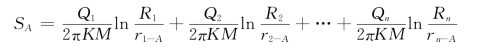 设在一无限的水平含水层中有n口完整井,按任意方式排列并相互干扰(图4-18)。各井的干扰抽水量为Q1-A、Q2-A,…,Qn,井群影响范围内有任意计算点A,各井到A点的距离为r1,r2,…,rn-A。当各井同时工作,按叠加原理,计算点A的总降深是各井单独工作时在A点产生的降深之和: