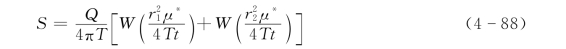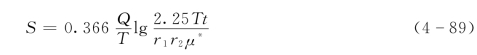 式(4-88)和式(4-89)就是直线隔水边界附近完整井的水位降深公式。由式(4-89)可见,降深S和时间的对数值lgt呈直线关系,当隔水边界产生影响时,该直线的斜率。在无界含水层中S-lgt曲线的斜率