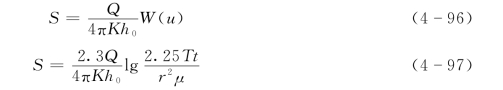 (1)以Sw表示抽水井中的水位降深,当时,即可认为水位降深与潜水含水层厚度h0相比很小,可忽略不计,则式(4-76)及式(4-78)可分别写成
