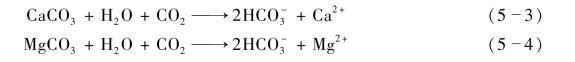 在地下水中HCO3-有几个来源,首先来自含碳酸盐的沉积岩与变质岩(如大理岩)的水解,其反应式为
