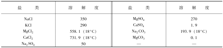 由表5-2可见,氯盐的溶解度最大,其次是硫酸盐,碳酸盐较小。钙的硫酸盐、钙和镁的碳酸盐溶解度最小。当水的矿化度由小增大时,钙、镁的碳酸盐极易达到饱和而从水中析出,继续增大时,钙的硫酸盐也饱和析出。因此,高矿化水中只有氯离子和钠离子占其优势。