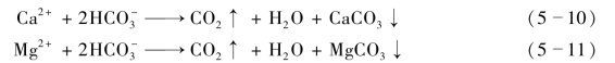 CO2在水中的溶解度受环境温度和压力控制,其溶解度随温度升高或压力降低而减小。当温度升高或压力降低时,一部分CO2便成为游离CO2从水中逸出,这种作用称脱碳酸作用。其反应式为