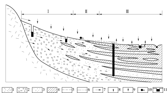 1—基岩;2—砾石;3—砂;4—粘性土;5—潜水位;6—承压水位;7—地表水及地下水流向;8—降水补给;9—蒸发排泄;10—下降泉;11—井,涂黑部分有水