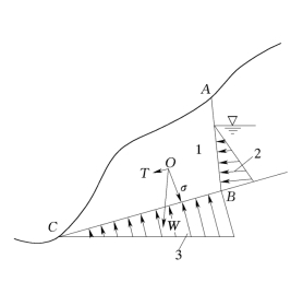 1—潜滑体;2、3—空隙水压力分布图;W—潜滑体自重;σ—正应力;T—切向分力;AB—张裂隙;BC—潜滑面(带)