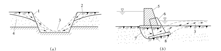 (2)打板桩。其目的一方面是加固坑壁,另一方面是改善地下水的径流条件,即增长渗流途径,减小水力梯度和流速。