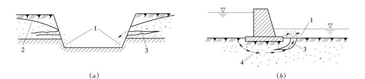 地基土在具有某种渗透速度(或梯度)的渗透水流作用下,其细小颗粒被冲走,岩土的孔隙逐渐增大,慢慢形成一种能穿越地基的细管状渗流通路,从而掏空地基或土坝,使地基或斜坡变形、失稳,此现象称为管涌(图7-11)。管涌通常是由于人类工程活动而引起的,但在有地下水出露的斜坡、岸边或有地下水溢出的地带也有发生。