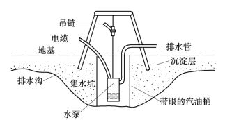 管的直径视水泵大小和过滤层的厚度而定。对流量不大的集水池,可在池中央安放一个带眼的、容积为250L的空气油桶,再在桶内高出桶底30cm吊装水泵;为了便于工作和防止埋泵,建议在地面支上一个侧链三角架,准备可以随时起泵(图9-4)。