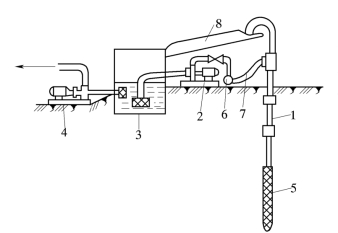1—井点管;2—高压水泵;3—循环水槽;4—低压水泵;5—滤管;6—导水总管;7—连接软管;8—排水槽