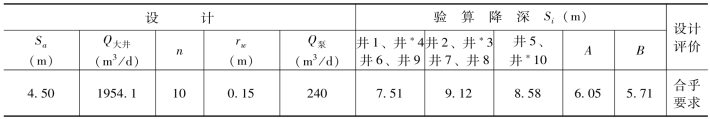 (3)基坑降水设计验算。式(4-40)适于本例验算基坑某点地下水位降深Si,该式为
