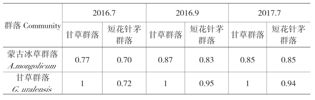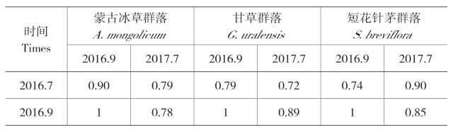 由表2-4 可见,3 个群落在不同调查时期的群落相似系数有不同变化,蒙古冰草群落的相似系数在2016年7月与2016年9月之间达0.90,但2016年7月、2016年9月与2017年7月之间的相似性分别下降为0.78 和0.79。甘草群落的相似性系数在2016年7月与2016年9月之间为0.79,2016年7月与2017年7月相比,相似性下降到0.72;2016年9月与2017年7月相比,相似性又提高到0.89。短花针茅群落相似系数在2016年7月与2016年9月之间为0.74,2016年7月、2016年9月分别与2017年7月相比,相似性均有所提高,分别为0.90 和0.85。同一时期内(见表2-5),不同群落之间的相似性结果显示,在2016年7月,蒙古冰草群落和甘草群落相比,群落相似系数为0.77,与短花针茅群落相比,群落相似系数为0.70,达到中等相似。甘草群落与短花针茅群落相比,相似性为0.72,为中等相似。在2016年9月和2017年7月,3 个群落间的相似性系数均上升,均达到极相似水平。