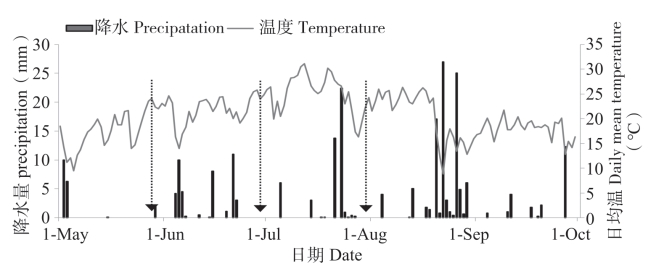 图3-1 研究区2017年5月至9月降水和平均温度的日变化(虚线箭头表示采样日期)
