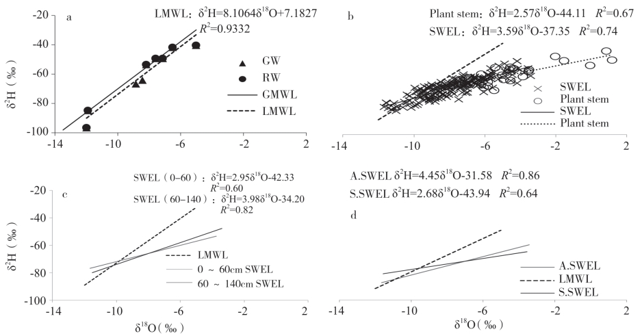 不同采样期降水的δ18O 值在-11.99‰~-5.01‰变化,δ2H 值在-96.71‰~-40.51‰变化,且随着降水量的增多其氢氧稳定同位素值变小趋于贫乏。基于研究区降水和地下水同位素特征的分析(图3-2-a),拟合成区域大气降水线方程:δ2H=8.11δ18O+7.18 (R2=0.93),相比于全球大气降水线(δ2H=8δ18O+10)(Craig,1961)和全国大气降水线方程(δ2H=7.92δ18O+8.2)(陈中笑等,2010),研究区大气降水线方程的截距偏小,斜率相似,比较接近全球气象水系(GMWL)的预期值。土壤水分同位素特征较降水富集,主要分布在研究区大气降水线的左下侧(图3-2-b),氢、氧同位素特征的变化范围分别为-81.56‰ ~-46.16‰和-11.93‰ ~ -3.41‰,土壤水分蒸发线的斜率和截距分别为3.59 和-37.35,小于研究区的大气降水线。植物茎秆水分氢、氧同位素分布于研究区大气降水线的右下侧(图3-2-b),其变化范围分别为-65.56‰~-38.62‰ 和-7.74‰~1.19‰,茎秆水分同位素特征拟合线的斜率和截距分别为2.57 和-44.11,R2=0.67,分别小于土壤水分蒸发线的斜率、截距和R2,在土壤水分蒸发线的右上角,部分值脱离出土壤水氢、氧同位素值的范围。