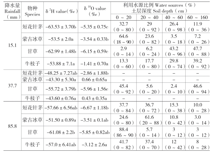 表3-2 在不同降水期4 种植物利用水源及其贡献比例